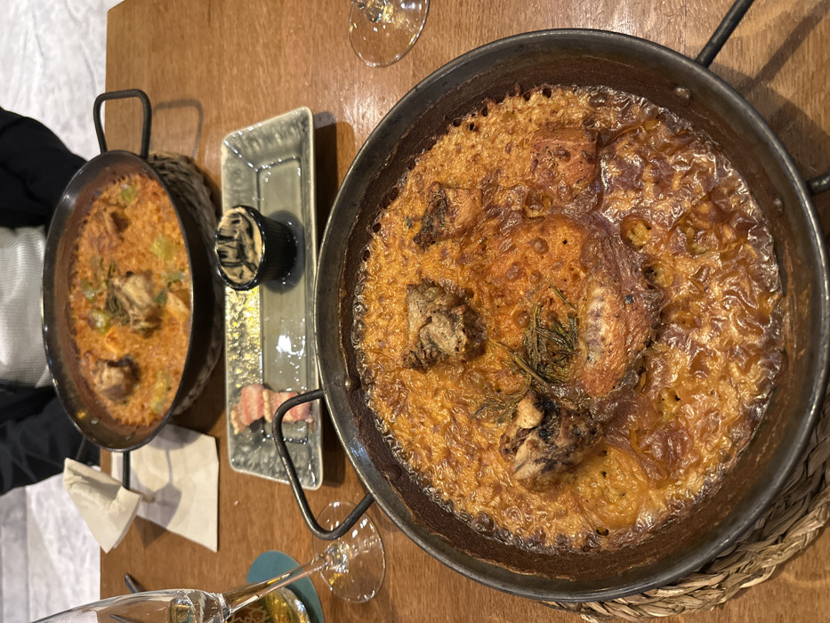 The scene depicts a dining table at a restaurant in València, Spain. In the foreground, a dark metal paella pan, resting on a woven mat, contains a golden-orange, crusted rice dish with visible pieces of roasted poultry or game and sprigs of fresh rosemary. To the left, a tall, stemmed glass holds an amber beverage. In the midground, a rectangular grey ceramic serving dish contains thin slices of red cured meat and a small black ramekin with a light-colored dipping sauce. Another identical paella pan with a similar rice dish is visible in the background, also on a woven mat. A partially visible person, wearing a dark jacket over a light garment, is seated beyond the background pan. The table surface is wooden, and the background wall is a light, mottled grey.