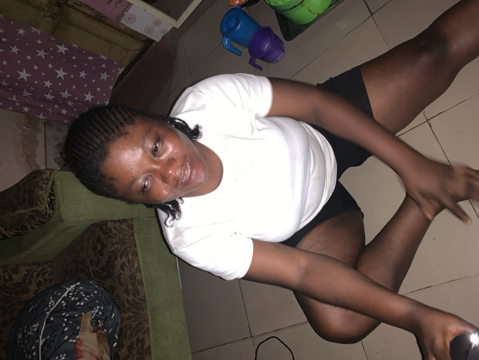 The scene is set indoors in Akwanga, Nigeria, showing an adult female seated directly on a light brown tiled floor