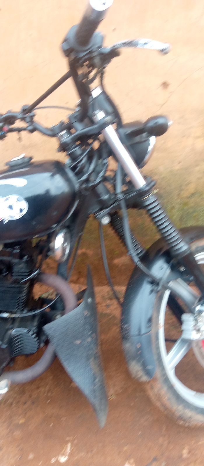 A black motorcycle is depicted parked on reddish-brown dirt ground in Ukwu-Abwa, Nigeria. The image focuses on the motorcycle's front and mid-sections, captured with visible blur. Essential details include black handlebars with silver-colored levers, a black fuel tank adorned with a white decal featuring a soccer ball graphic and text, and a black engine block with visible cooling fins and an emerging exhaust pipe. The front suspension assembly consists of silver fork stanchions and black corrugated dust boots. A black front fender is present above a front wheel, which features a silver alloy rim and a black tire, both showing dirt accumulation. A black, textured, triangular object, consistent with a mudguard or engine shield, is positioned below the engine and adjacent to the exhaust pipe, with a portion appearing distorted or bent. No individuals are present, and no actions or interactions are depicted.