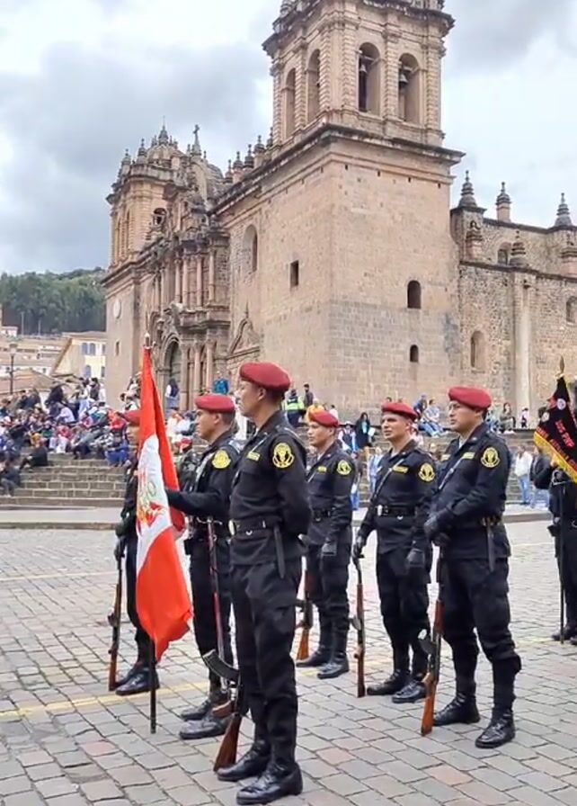 A line of uniformed men stands at attention on a cobblestone square. The men are wearing black uniforms with red berets and yellow insignia. Most of them hold rifles, while one man at the end carries a sword. To the left of the line, one man holds the Peruvian flag. Behind the men is a large stone building with a bell tower, with people visible on the stairs and in the square beyond. The sky is overcast.