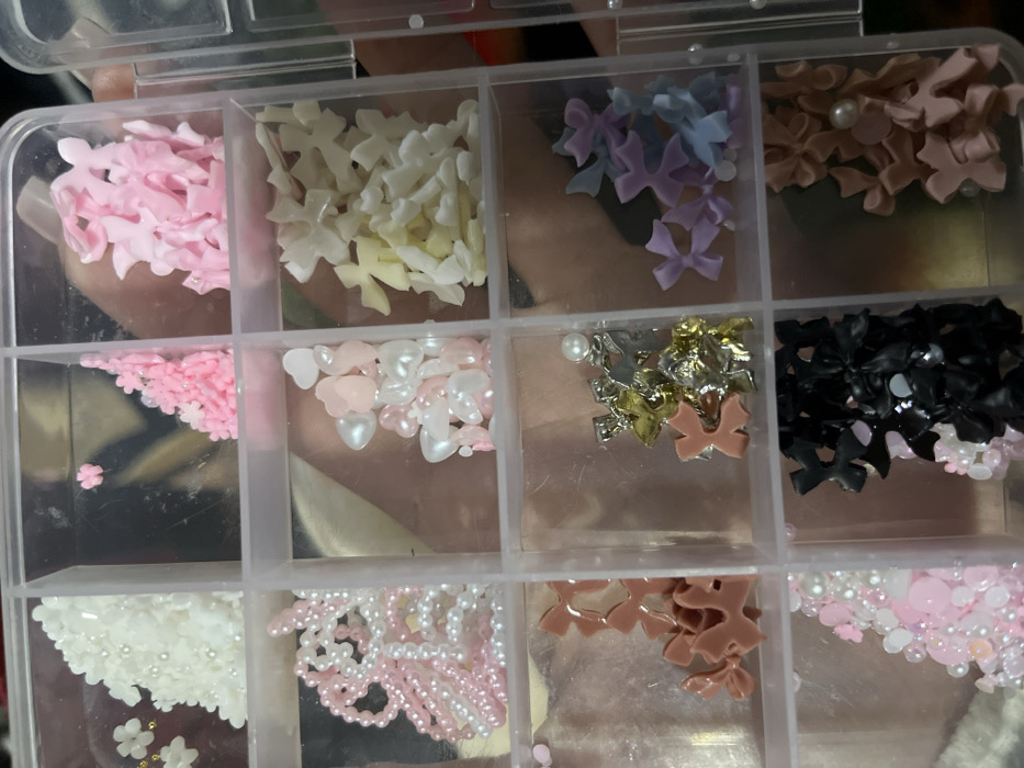 A clear plastic storage box contains twelve compartments filled with crafting embellishments. Rows showcase pink, cream, and pastel-colored bow charms, next to sections with white and pink floral accents and mixed pearl beads. Other compartments feature metal bows with pearls, black bow charms, and other varieties of smaller beads and shapes. The overall impression is of a collection intended for nail art or miniature crafts.