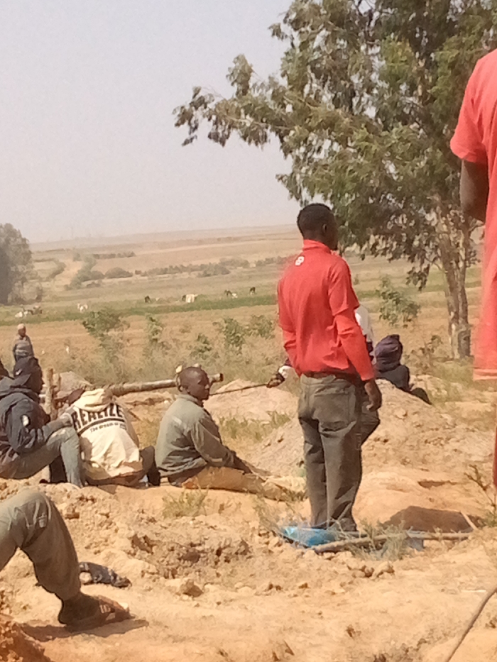 This image depicts an outdoor scene in South Ropp, Nigeria, under a hazy daylight sky. The foreground and midground consist of dry, light brown soil with several excavated earth mounds and sparse green vegetation. In the midground, a large tree with green foliage stands to the right of center. Six adult males are visible in the foreground and midground. One man, wearing a red long-sleeved shirt and dark trousers, stands with his back to the camera on a raised mound, observing the distant landscape. A blue tarp or mat is under his feet. To his left, another man in a light beige hooded jacket with "BE REALZE" text and dark trousers is seated on the ground. Further left, a third man in a dark hooded top is seated. A fourth man, wearing a light olive-green long-sleeved shirt and light trousers, is seated to the left, holding a long, dark pipe-like object. A fifth individual in a red shirt is partially visible on the far right. The lower left shows the legs and feet, clad in olive-green trousers and sandals, of a sixth person. The background reveals a vast, flat landscape of agricultural fields with patches of green vegetation and scattered distant trees. Several small animals, possibly goats or cattle, graze in these fields. What appear to be articles of clothing are visible hanging in the distance. The horizon is marked by indistinct structures, possibly utility poles or towers, beneath a pale sky. The individuals are either standing, seated, or partially obscured, with no clear direct interactions visible between them.