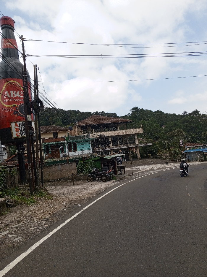 This image depicts a street scene in Ciloto, Indonesia, under an overcast sky. In the foreground, an asphalt road with a white solid line on its left edge curves gently to the right. On the right side of the road, a single individual wearing a helmet and a light-colored jacket is operating a white scooter, traveling away from the viewer. To the left of the road, on an unpaved shoulder, two motorcycles are parked. Adjacent to these motorcycles are small, simple structures with green roofs, possibly roadside vendors or shelters. Behind these structures, a complex of multi-story buildings is visible, set against a backdrop of dense green foliage. One prominent building features a reddish-brown tiled roof and multiple levels with open-air balconies, appearing weathered. A lighter blue building is situated lower and to its left. Dominating the left side of the frame is a colossal replica of a red and black "ABC Kecap Manis" (sweet soy sauce) bottle, functioning as an advertisement. This bottle is affixed to a utility pole structure from which numerous overhead power or communication lines extend horizontally across the upper portion of the scene. The distant background is characterized by lush green hills covered in trees.