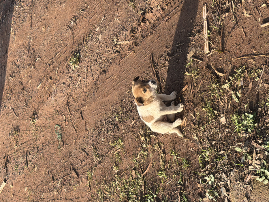 - "A small, light brown and white puppy sits in the dirt" by FM-vA9lX2, licensed under CC BY 4.0