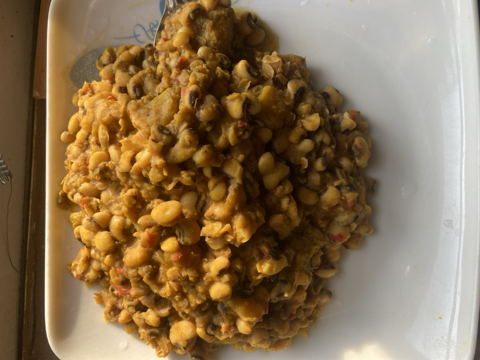 A white square plate contains a pile of cooked beans, possibly black-eyed peas, with a golden-brown sauce. The beans are mixed with diced vegetables, some pieces appearing red. The texture seems soft and moist, suggesting a stew or porridge consistency. A utensil slightly visible suggests recent serving or stirring of the dish. The presentation is casual, likely home-cooked.