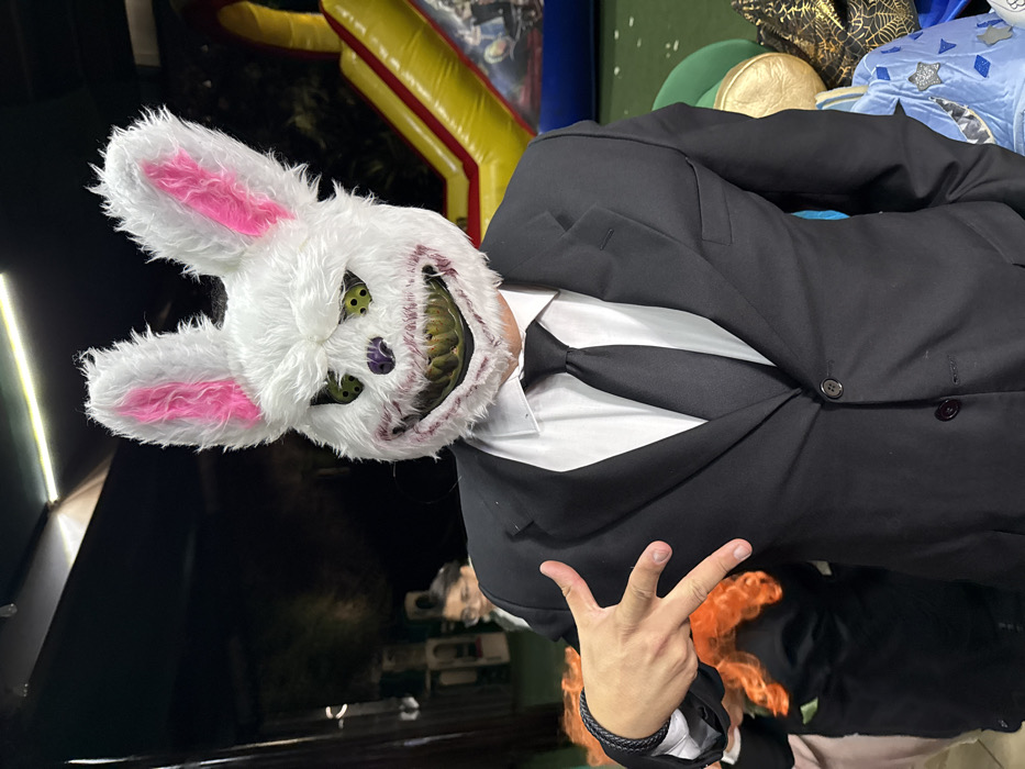 A person wearing a white, menacing rabbit mask with pink ears, yellow eyes, and sharp teeth. They are wearing a black suit with a white shirt and a black tie. The individual is making a hand gesture, and there is an orange, feathery object near their hand. The background features a dark setting with an inflatable structure in the distance.