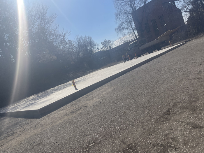 The image depicts an outdoor scene in Lovech, Bulgaria, under a clear blue sky with bright sunlight causing a prominent lens flare from the upper left. The foreground consists of an unpaved surface composed of dirt and gravel. In the midground, an elongated, rectangular concrete slab, appearing recently poured and light grey, lies level with the ground. Several orange-capped vertical markers are embedded into the concrete slab: one is positioned in the left half of the slab, and three others are spaced along its length towards the right. Behind the concrete slab, a dark-colored flatbed truck is parked, its bed laden with multiple horizontal wooden planks. In the background, a multi-story brick building, appearing derelict with visible structural damage and open window frames, stands partially obscured by numerous bare deciduous trees. No individuals are visible within the frame.
