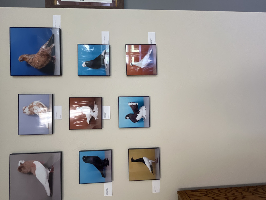 The image displays an interior wall in Oklahoma City, Oklahoma, United States, featuring nine framed photographs of domestic pigeons