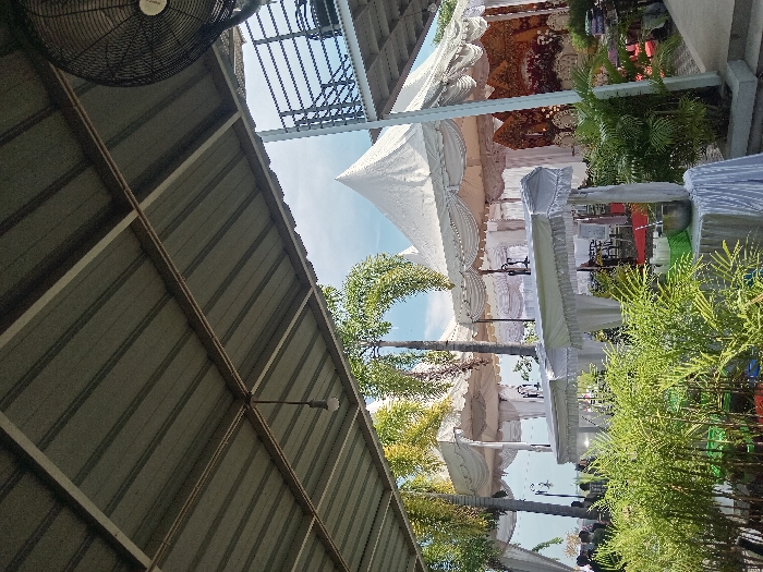 The photo depicts an outdoor event space, possibly a wedding or celebration. A large white tent structure with draped fabric is visible. Tables draped in white linen are arranged outdoors, surrounded by greenery. A partial view of a metal roof overhang with a fan is in the foreground. The sky is blue, and the overall impression is of an outdoor festive atmosphere. The photo is taken at an angle, giving a unique perspective of the setup.