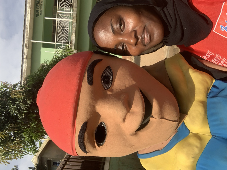 This image depicts a close-up outdoor scene in Jos, Nigeria, featuring two individuals. On the left, a person is wearing a mascot costume characterized by a large, light brown, stylized head with a red cap. The mascot's face includes black mesh eyes (the right eye showing a distinct iris/pupil pattern), prominent black eyebrows, a small nose, and a wide, smiling mouth revealing black interior material. Below the head, the costume's torso is visible, featuring blue and yellow segmented padding. To the right, a dark-skinned woman, wearing a black hijab and a red shirt, smiles subtly while looking directly at the camera. Partial white text on her red shirt reads "Dynasty" and "Women." The background includes a clear, bright sky, a large green tree, and a multi-story, light green building. The building prominently displays the white text "NEW GENERATION NURSERY/PRIMARY" on its facade, indicating a school, and features a balcony with white metal railings. A portion of another building and a wooden fence are visible further to the left. The ground in the visible background appears unpaved.
