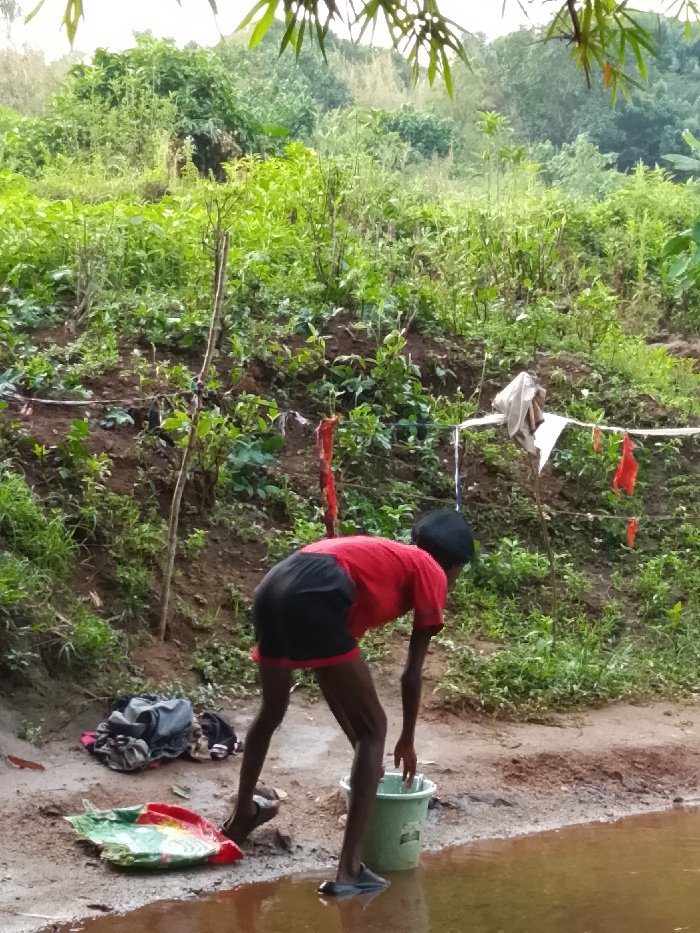 A person in a red shirt and dark shorts is bent over a green bucket near a body of water. They appear to be washing something, with their hand in the bucket. A pile of clothes lies on the bank nearby, along with a flattened plastic bag. Behind the person is a lush green hillside with clothes hanging on a makeshift clothesline strung between stakes. The scene evokes a rural setting.