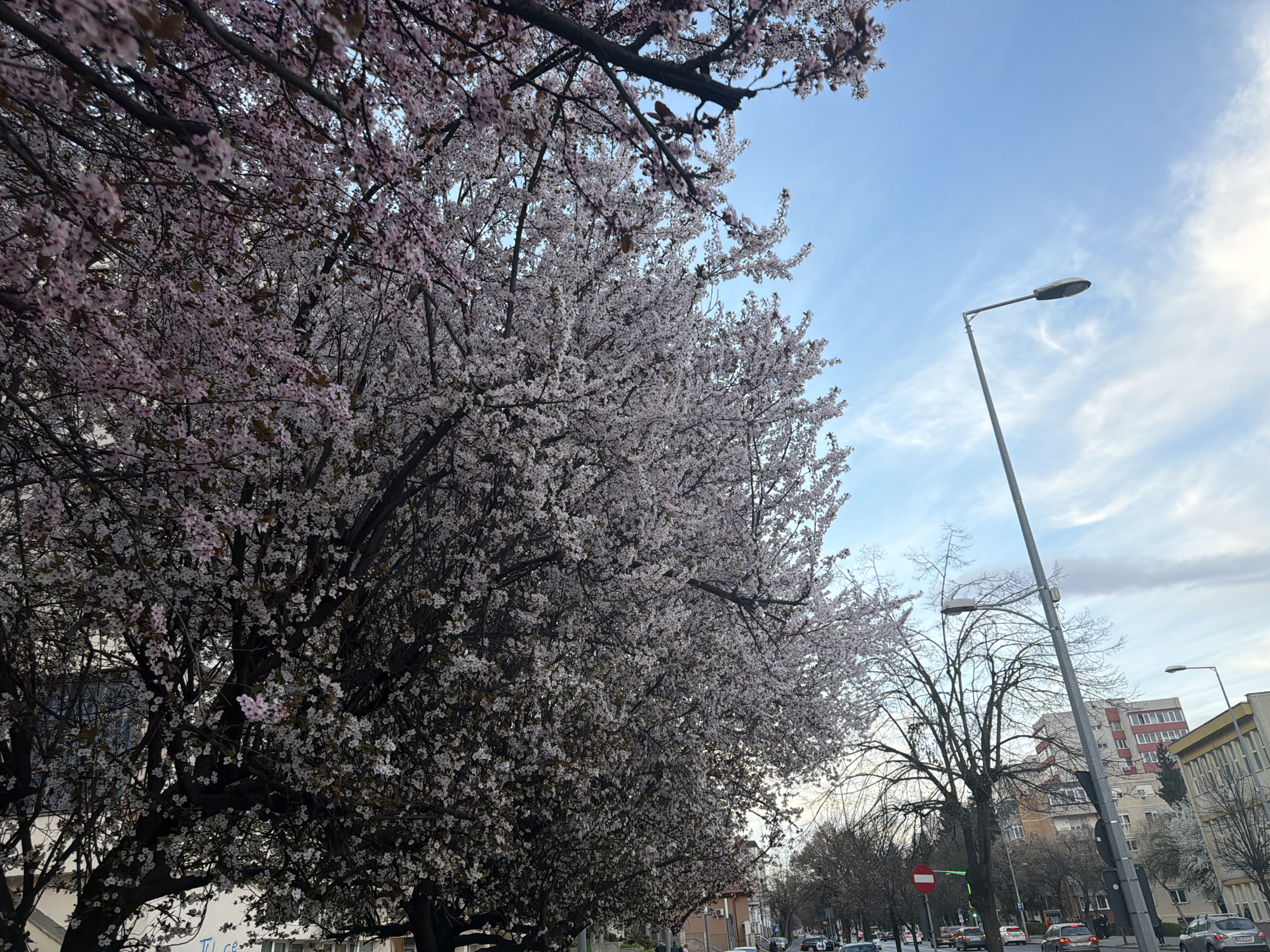 The image presents an urban street scene in Târgu Mureș, Romania. The foreground is dominated by a dense row of trees in full bloom, featuring abundant pink and white blossoms, indicative of springtime. Above the flowering canopy, a light blue sky with scattered white clouds is visible. A tall, gray metal streetlight pole with a curved arm and an ovular luminaire extends upward from the right side of the frame. In the background, beyond the trees, a paved roadway accommodates multiple passenger vehicles, some parked and others in motion. A red and white circular traffic sign is partially visible near the street. Architectural structures line the street; these include multi-story buildings, such as a distant building with prominent red and white facades, and a building with lighter-colored walls (possibly beige or yellow) and multiple windows situated closer on the right side. Further down the street, additional bare deciduous trees are visible alongside more distant urban infrastructure. No individuals are clearly discernible.