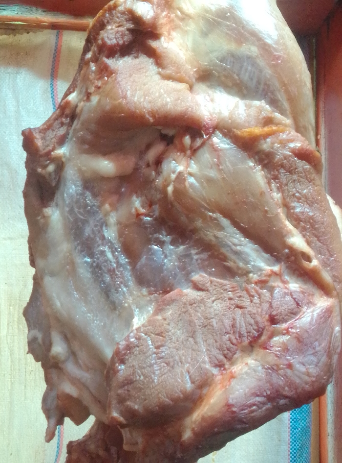 A large, irregularly shaped cut of raw red meat, consistent with a pork or beef shoulder/leg, is depicted in a close-up, vertical orientation