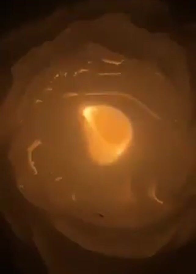 A close-up view from above shows an LED candle with an orange, flickering light source within its wax-like body. The candle sits in darkness.