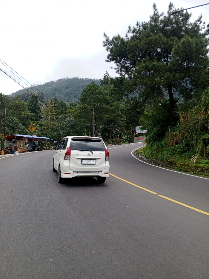 A white Toyota Avanza multi-purpose vehicle (MPV) with Indonesian license plate 'F 1348 US' is depicted from the rear, traveling on a curved, two-lane asphalt road