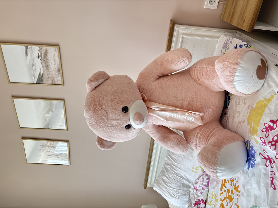 A large, light pink plush teddy bear is seated upright on a bed in a room located in Dabene, Bulgaria