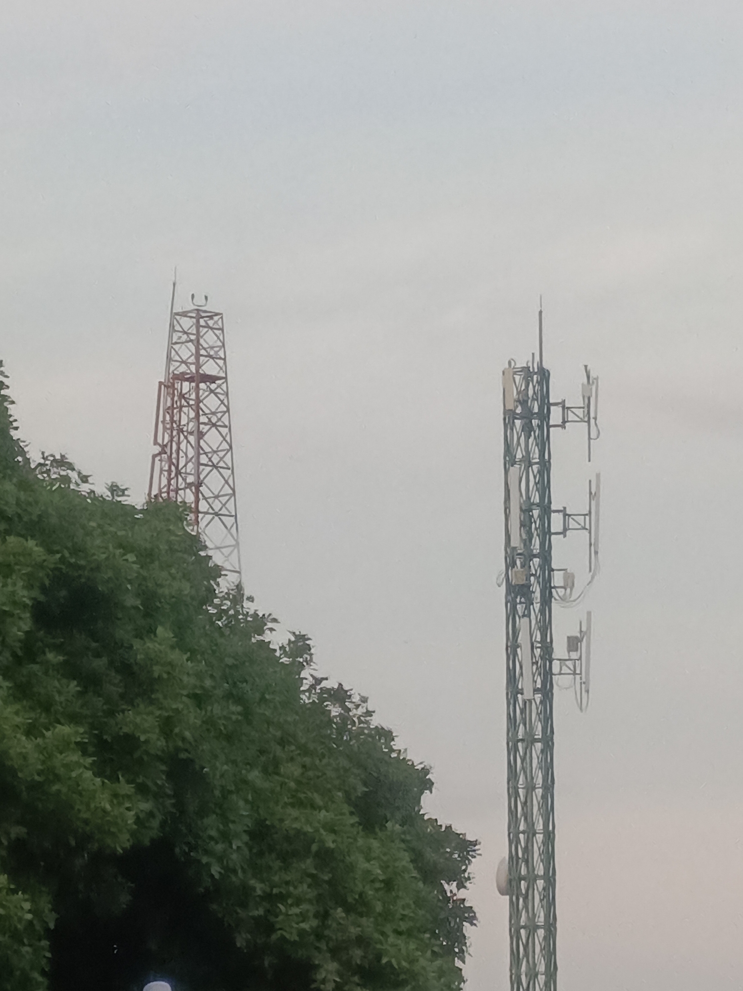 two telecommunication towers near a tree in Tinaco, Venezuela. One tower is a red lattice structure, while the other is a gray tower equipped with multiple antennas. The sky is overcast.