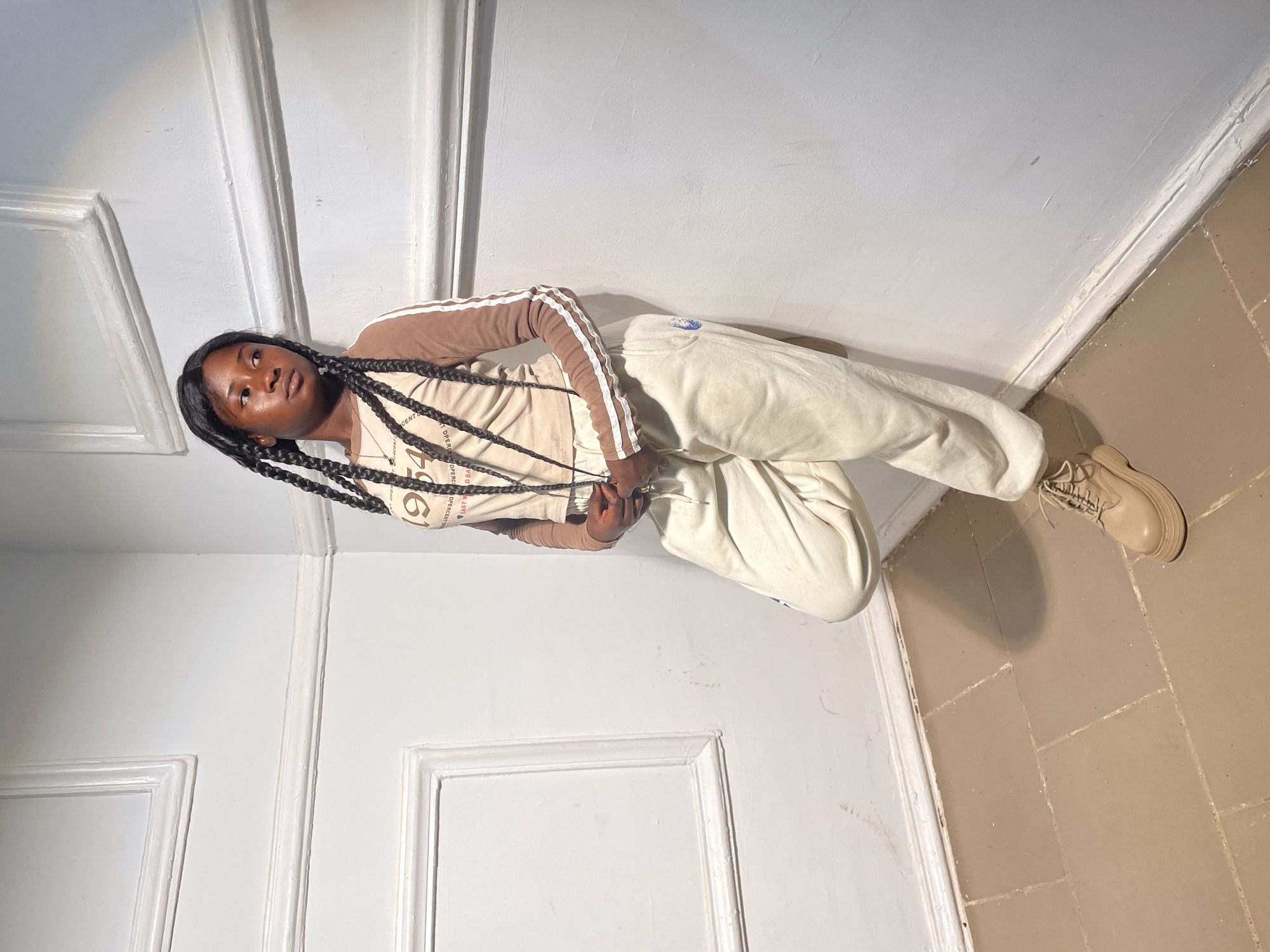 The image depicts a young adult female standing in the interior corner of a room. The specific location within the city of Barakin Akawo, Nigeria, is not visually discernible from the image, which showcases a plain indoor setting. The subject is a female with dark skin and long, dark braided hair. She is wearing a light beige, long-sleeved cropped top with brown sleeves that feature two white horizontal stripes on each. The front of the top has dark text, including the number "1954." She wears light cream-colored sweatpants with a blue emblem on the left thigh and light beige, chunky-soled lace-up boots. A thin necklace with a small pendant is visible around her neck. She is positioned with her back and right side leaning against the corner of the two white walls. Her right leg is bent at the knee, with the foot resting against the wall, while her left leg is straight, with her foot flat on the floor. Her hands are clasped together in front of her waist. Her head is turned slightly to her right, and her gaze is directed away from the camera. The environment consists of two white walls meeting at a corner, forming the background. Both walls are adorned with horizontal and vertical rectangular decorative moldings. The floor is composed of large, light brown rectangular tiles with visible grout lines. The lighting appears to be from the upper right, casting shadows on the wall behind her left leg and arm.