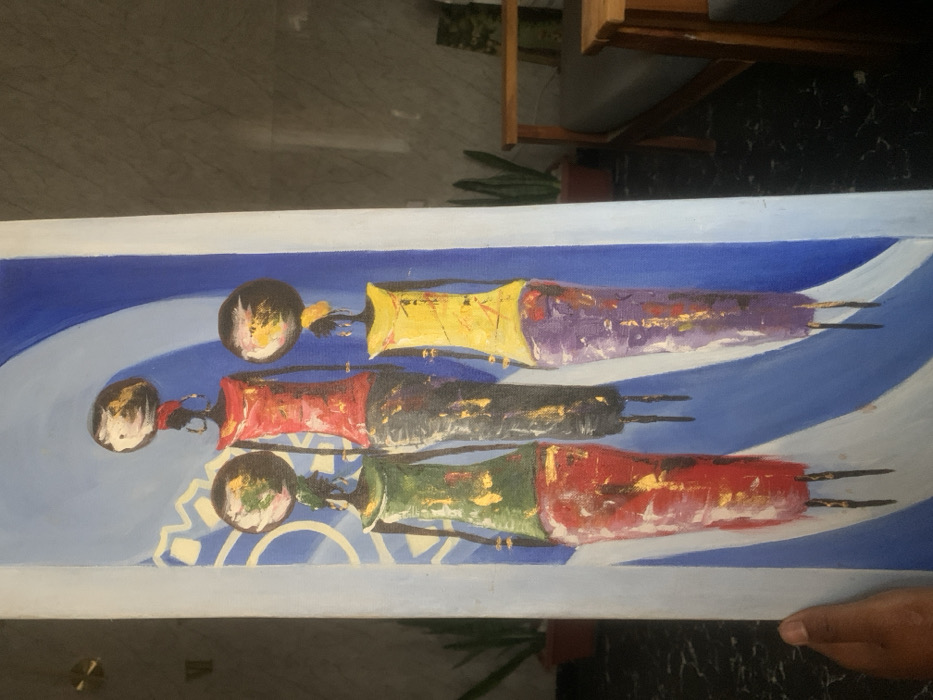 An abstract painting depicts three figures horizontally aligned against a blue and white background