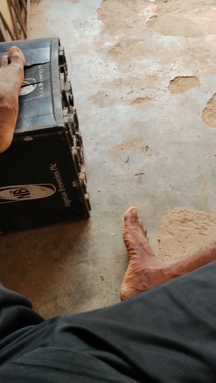 A person sits with bare feet visible on a concrete floor with patched areas. One foot rests atop a black plastic crate labeled "Nigerian Breweries Plc" with an "NB" logo. The other foot is on the floor. The individual wears dark-colored pants. The setting appears to be an indoor or sheltered area.