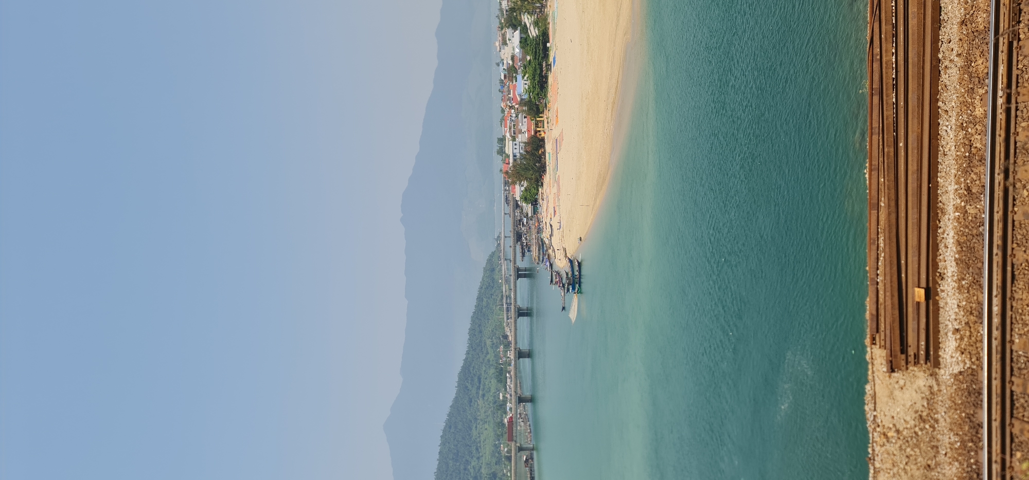 An aerial view of the coast of Huế, Vietnam, shows a town along a sandy beach and a bridge stretching across a body of turquoise water. The foreground contains railroad tracks along the edge. A mountain range is in the distance on the left.