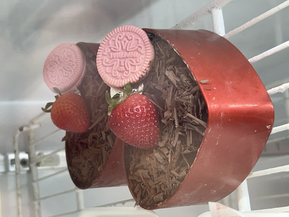 Two red, cylindrical containers hang on a white wire rack. Each holds shredded brown material, presumably chocolate. A pink-frosted sandwich cookie sits on top of the shredded material in each container. Hanging from the cookies are vibrant red strawberries with green stems. The strawberries appear to be attached or balanced on the cookies. The scene suggests a creative dessert presentation.