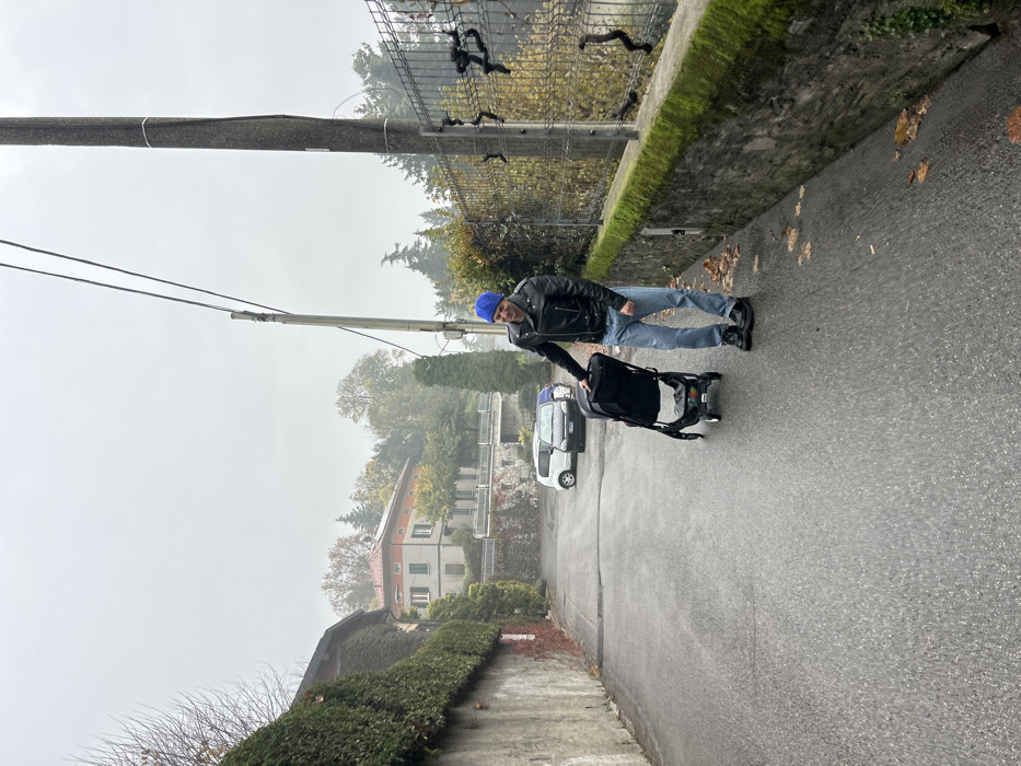 This image depicts a residential street in Erba, Italy, under an overcast sky, with the asphalt road appearing wet. In the foreground and midground, a lone adult male stands on the right side of the road, facing slightly right with his head turned towards the camera. He is wearing a black leather jacket, light blue distressed jeans, black chunky-soled shoes, and a bright blue beanie hat. His right hand rests on the handle of a black, partially collapsed baby stroller, which is positioned on the road. The stroller has visible colorful patterned fabric in its lower storage basket. Scattered brown autumn leaves are present on the wet asphalt, particularly along the right edge of the road. To the left, a concrete wall covered densely with green ivy and patches of reddish foliage extends into the distance. In the background, behind the curve of the road, three parked cars are visible: a white hatchback, a dark gray hatchback, and a third darker vehicle partially obscured. Further beyond, a multi-story building with a terracotta roof and light-colored walls stands amidst numerous trees and dense foliage, situated on a terraced landscape. To the right, a stone wall, topped with a strip of bright green moss, runs parallel to the road. Above this wall is a dark metal fence, featuring several dark, irregular, wavy objects attached to it. A tall, dark utility pole with overhead wires extends vertically along the right side of the frame. Another utility pole and wires are visible further in the background on the right. The distant treeline appears somewhat muted by atmospheric haze.