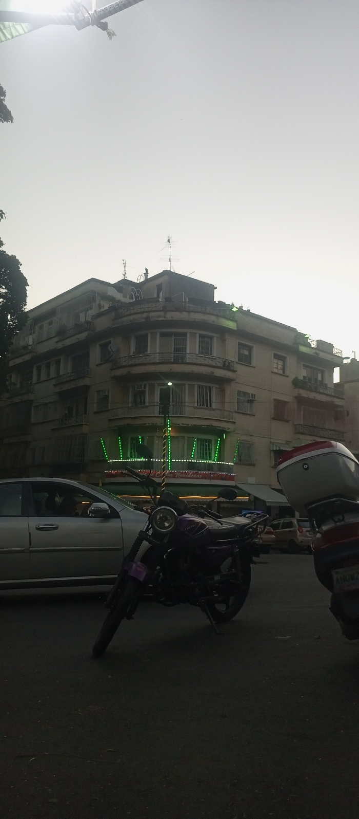 This image displays an urban street scene in Caracas, Venezuela, captured during dusk or early evening hours. The foreground consists of a dark asphalt road. On the right, the rear portion of a white and red scooter is visible, with a partially legible license plate displaying "AHO2M Z". A purple motorcycle with a circular headlight is positioned diagonally to the left of the scooter, facing left, occupying the center-left foreground. Behind this motorcycle, a silver sedan moves left, its driver's silhouette visible through the window. The midground and background feature a multi-story, light-colored building with a prominent rounded corner. The ground or first level of this structure is illuminated by bright green neon-style strip lighting, with a sign above it partially displaying the word "Navideñas." The building has multiple windows, some equipped with metal security bars, and balconies with railings. Several air conditioning units are visible on the exterior. The rooftop is cluttered with various antennas and a dark, box-like structure. The sky above is a pale, hazy gray, indicating low light conditions. No other individuals are distinctly visible or identifiable.