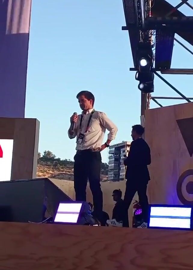 A medium shot, taken at low angle, shows a man standing on a stage, speaking into a microphone. He is wearing a light-colored, button-up shirt and dark pants. His left hand is holding the microphone, and his right hand is resting on his hip. Behind him, to his right, stands a man in a dark suit, partially obscured. In the background, there is a screen displaying information, including the name "Tomás Echeñique" and the word "EMPRESA: Tazki." Stage lighting is visible, including several blue lights. The backdrop is a light blue sky and a building in the distance. The stage appears to be made of plywood. The camera is relatively steady. The man is giving a presentation or speech.