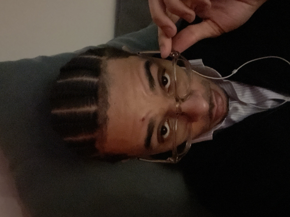 A male individual is depicted in an overhead, close-up indoor portrait. The subject exhibits dark skin and dark hair styled in multiple, distinct front-to-back braids. A small, dark blemish is present on the subject's forehead, superior to the glabella. The subject is wearing translucent, light-colored framed spectacles, which are being held by the right hand at the temporal region, slightly displacing them inferiorly on the nasal bridge. Direct eye contact is established with the camera. White wired earphones are observed; one earbud is positioned in the left ear, with the cable extending inferiorly. The subject is dressed in a dark-colored outer garment over a light-colored, possibly striped, collared shirt. The background consists of undifferentiated dark and lighter surfaces, consistent with an interior setting. No specific geographical markers are present within the frame to indicate a precise location in Montigny-le-Bretonneux, France.