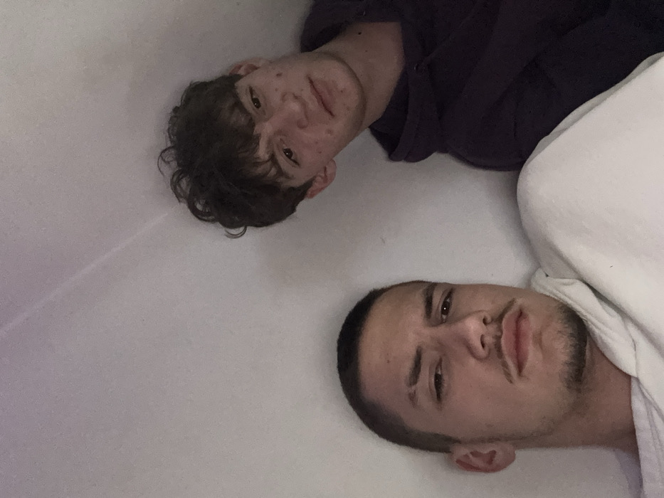 Two males are depicted in a close-up, low-angle photograph, likely taken indoors against a plain, light-colored background that appears to be a wall or ceiling. No specific identifying features of a location in Shumen, Bulgaria, are discernible from the image. The individual on the left occupies the lower-left portion of the frame. He is a male with a short buzz-cut hairstyle, dark hair, and a visible scar or split in his left eyebrow. He has a faint mustache and goatee. He is wearing a light-colored garment, possibly a white or light grey t-shirt or hoodie, and is looking directly towards the camera with a neutral expression. The individual on the right occupies the upper-right portion of the frame. He is a male with dark, curly hair and a dark-colored hooded sweatshirt. His face exhibits multiple blemishes, consistent with acne. He is looking slightly away from the camera, or with a slightly pensive expression. Both individuals are in close proximity, suggesting they are positioned side-by-side or leaning against each other. The lighting is somewhat dim, with soft shadows visible. No other objects or activities are depicted.