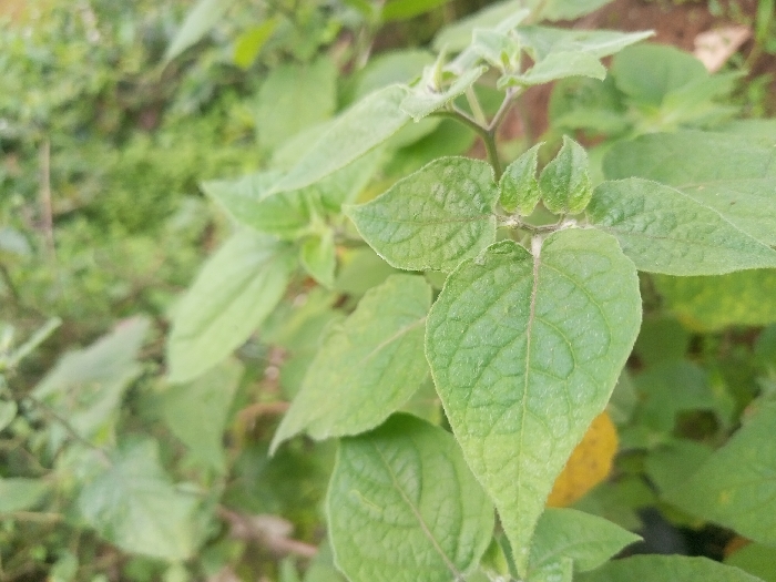 The image displays a close-up view of a green plant, situated in Ciherang, Indonesia. The primary subject is a cluster of broad, green leaves with a visible textured surface and distinct venation. Towards the upper center, several small, green, bladder-like structures, consistent with immature fruit calyxes (possibly of the *Physalis* genus), are present. The background is out of focus, showing blurred green foliage and hints of brown earth. No individuals, animals, or man-made objects are depicted. The scene is naturally lit.