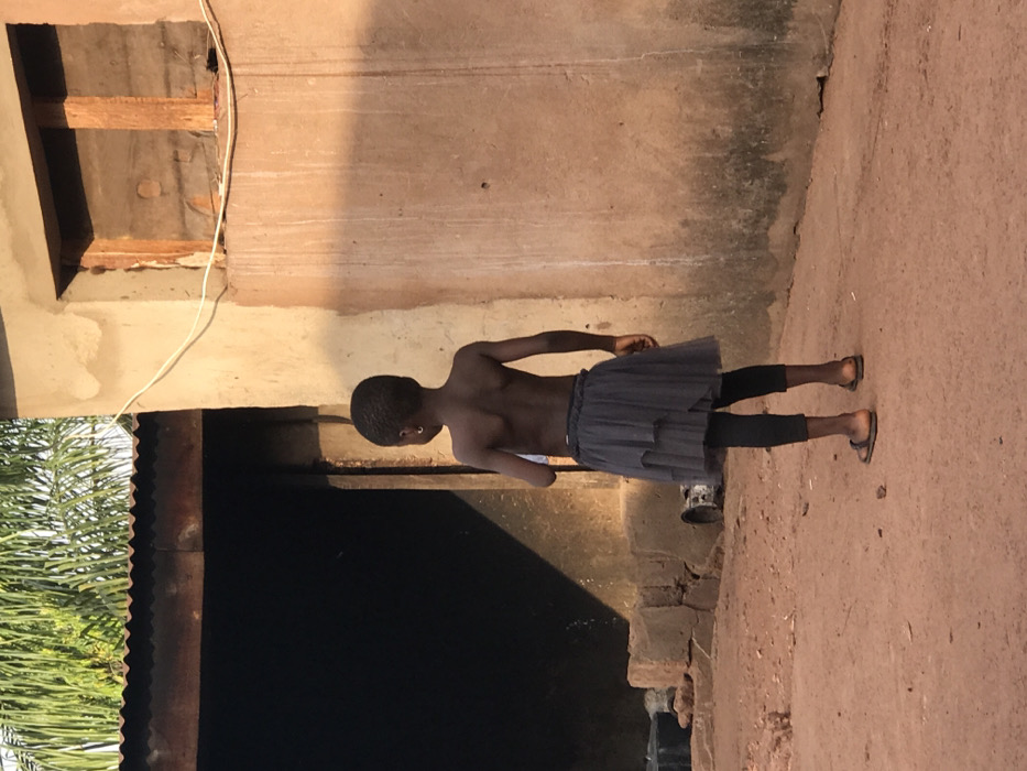A young girl with dark hair, wearing a gray tutu, black leggings, and sandals, stands near a building. The building features a light-colored wall with a visible window frame and a corrugated metal roof on the side. A white electrical wire runs along the wall. The ground is reddish-brown. Palm trees are visible on the left side.
