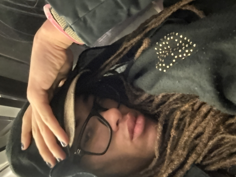 A close-up, slightly rotated image shows a person with dark-framed glasses and dreadlocks. They wear a hooded jacket with a skull design made of shiny embellishments on the right side. The person's left hand rests on their forehead, displaying manicured fingernails with a dark polish. The person appears tired or relaxed.