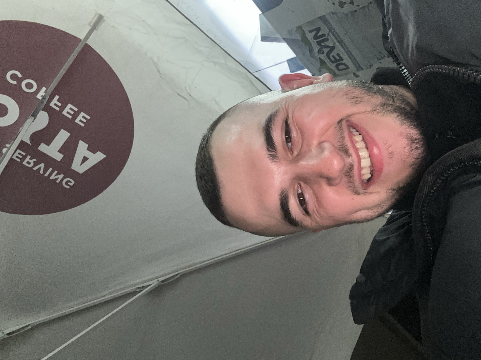 A man smiles into the camera in an indoor setting. Behind him is a sign that reads "Coffee Atelier," suggesting he is likely at or near a coffee shop. The sign's lettering is oriented in reverse, which could indicate that the photo was taken using a front-facing camera and the sign is viewed through a mirrored perspective. The man is wearing a dark jacket. Based on the sign, the location is likely the Coffee Atelier in Plovdiv, Bulgaria. The background is mostly out of focus, but tiled walls or floors can be seen.