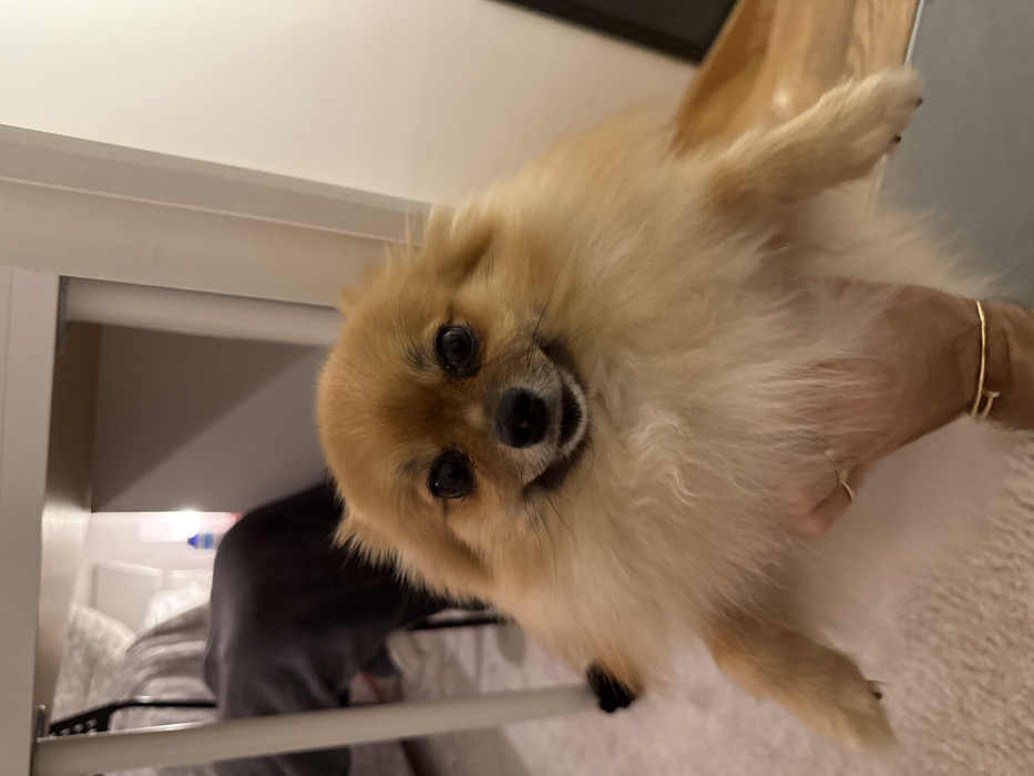 - "An indoor scene in Chambœuf, France, depicts a small, fluffy dog, likely a Pomeranian, with tan and cream-colored fur, centered in the frame" by FM-EvMDo2, licensed under CC BY 4.0