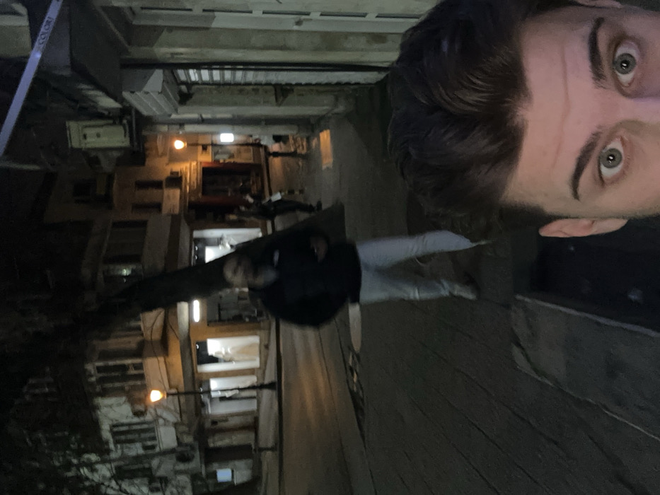 The image captures a nighttime urban street scene in Plovdiv, Bulgaria. In the immediate foreground, the upper portion of a person's face is visible, showing brown, wavy hair and wide, light green eyes, indicating a low-angle perspective, possibly a selfie. Directly behind the foreground subject, a male figure stands on a paved sidewalk. He is dressed in a dark jacket or hoodie and light-colored pants, holding a dark object, likely a mobile phone, in his left hand. This figure is slightly blurred, suggesting motion or low-light conditions. The background consists of multi-story buildings lining both sides of the street. On the left, a corner building features ground-level shopfronts with interior lighting, alongside a streetlamp emitting an amber glow. A thick, leafless tree trunk stands on the sidewalk between the standing man and the buildings. On the right, a building with a partially closed roll-down shutter and a blue awning, which appears to display the text "COLORI," is present. Another streetlamp is visible further down a narrow alley or street to the right. Two additional, indistinct human figures are discernible in the distance within this alley. The street and sidewalks are paved, with circular manhole covers visible on the ground. The scene is dimly illuminated by streetlamps and light emanating from building interiors.