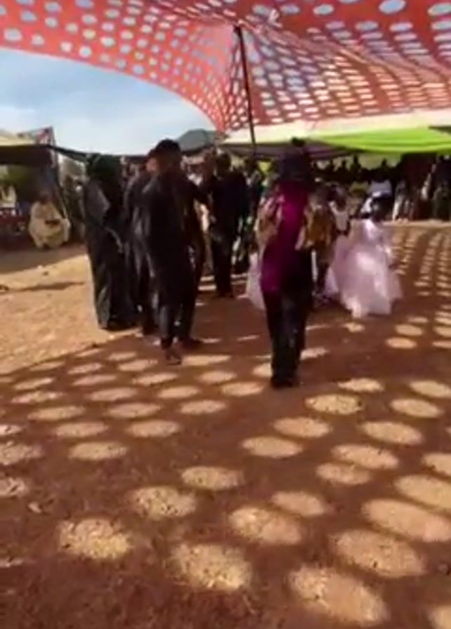 group of people dancing at what appears to be a wedding or celebration outdoors. There are several children wearing white dresses, and men dressed in black attire, some with gold accents. The ground is brown dirt. Above, there is a colorful awning with red circles on a white background, providing shade. In the background, more people are gathered under green and white awnings. The camera is held at ground level and pans to follow the dancers.