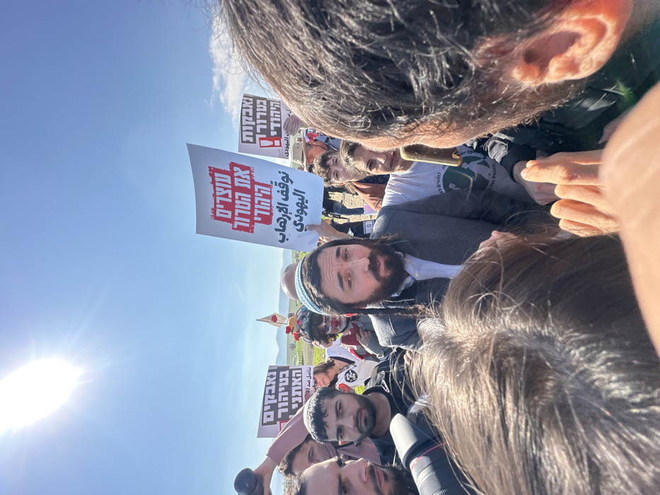 A crowded outdoor gathering is depicted under a bright, sunny blue sky in Ras 'Ein al 'Auja, Palestinian Territory, with the sun prominently visible in the upper left. A central bearded man with peyos (sidelocks), wearing a light blue kippah, white collared shirt, and dark grey suit jacket, is speaking while surrounded by other individuals. To his immediate left, a man with a dark beard wearing a black shirt observes him, and a black camera lens is partially visible. Further back, a person in clown makeup with a colorful hat is partially seen. To the central figure's right, a woman wearing a light-colored t-shirt with "for Peace" text looks towards him, and a hand holds a smartphone, seemingly recording. The immediate foreground is obscured by the top of a dark-haired head and a hand. In the background, numerous individuals are gathered on green ground with distant hills, holding protest signs. A prominent white sign features red Hebrew text reading "עוצרים את הטרור היהודי" (Stop the Jewish Terror) and Arabic text "نوقف الإرهاب اليهودي" (We stop Jewish terrorism). Another partially visible sign displays black Hebrew text reading "ונאבקות בטרור היהודי" (And we fight Jewish terror). The scene captures an active public assembly or protest.
