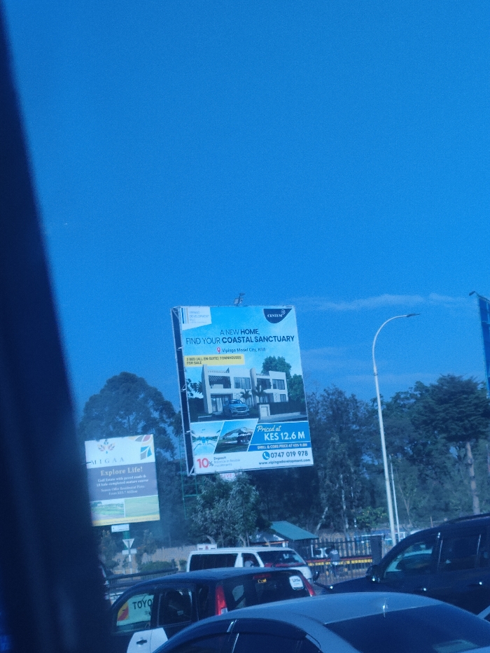 two billboards. One advertises new homes, "Coastal Sanctuary" in Vipingo Model City, Kilifi, featuring "3 Bed All En-suite Townhouses For Sale" priced at KES 12.6 M, with a phone number 0747 019 978 and a "Centum" logo. The other billboard promotes "MIGAA" and encourages viewers to "Explore Life!". A sliver of a "TOYO" brand sign is visible. Cars are in the foreground, suggesting the billboards are on a roadside. The sky is clear blue.