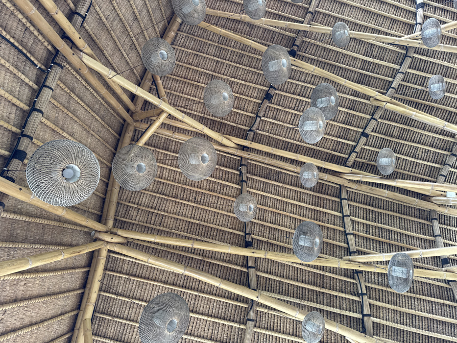 A high-angled shot reveals a textured ceiling constructed from bamboo and thatch. Round, woven light fixtures are suspended at varying heights and positions throughout the structure. The bamboo beams intersect in a pattern, while the thatched ceiling provides a textured backdrop. The lights appear diffused, adding a soft, ambient element to the ceiling's design.