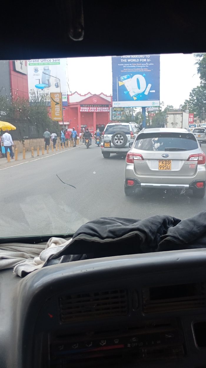 A view from inside a vehicle looking onto a busy street with pedestrians and vehicular traffic. The building, painted red, is "TAPOO'S COMPLEX DURA POA SECOND HAND COLLECTIONS". A large billboard advertises "Grand Office Sale" and another promotes money transfer from Nakuru to the world. Vehicle number plates, "KAG 418J" and "KDS 995U" are visible. The vehicle interior is visible in the foreground, with a dark dashboard. The image suggests a typical urban environment in Nakuru.