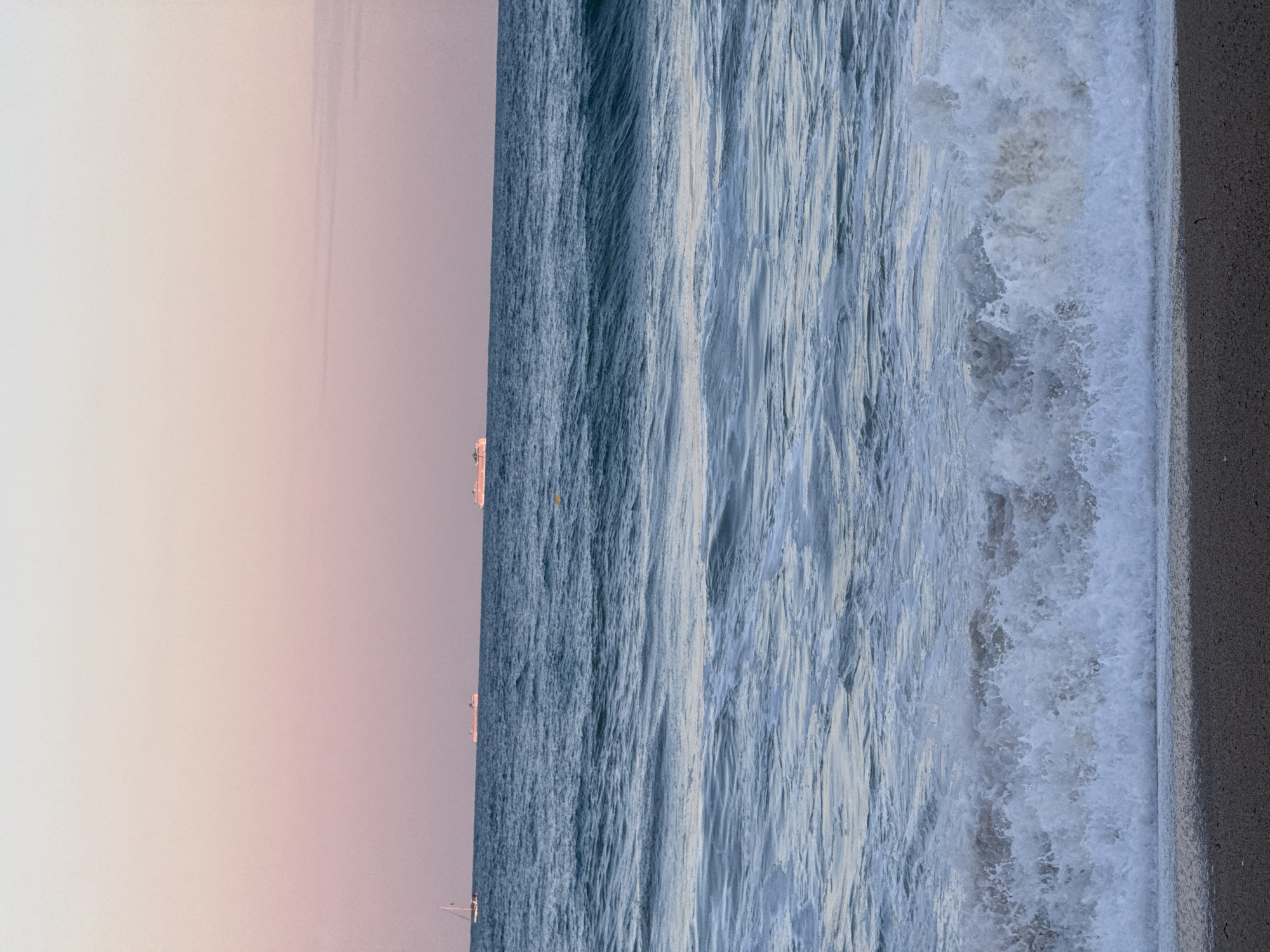 view of the Mediterranean Sea, likely taken from a beach or breakwater in Barcelona, Spain. The sky is pale with a hint of pink. There are several ships on the horizon. The water has various shades of blue and white. Along the right edge of the image is a gray surface that is likely part of a concrete structure along the waterfront. A wave is crashing against the concrete structure.
