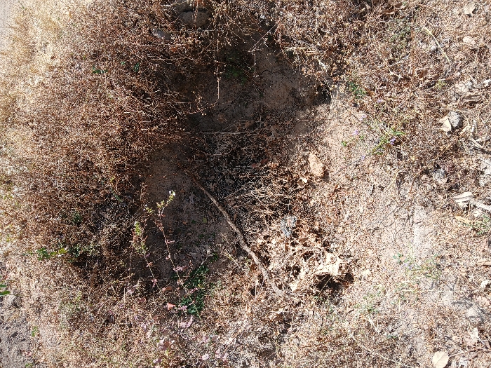 A forensic examination of the image reveals an outdoor scene on dry, light-brown soil, located in Unguwar Saya, Nigeria. The primary subject is a circular depression or dug-out hole, approximately 40 centimeters in diameter and 20 centimeters deep, situated centrally within the frame. The interior of the hole displays darker, disturbed earth, and contains a single light-brown, slender wooden stick, approximately 20 centimeters in length, resting horizontally along its lower inner wall. The immediate perimeter of the depression is characterized by a dense growth of withered, thorny, light-brown scrub and desiccated plant matter. The surrounding ground further out consists of similar dry soil, interspersed with sparse patches of green vegetation, including small, low-lying plants, one displaying diminutive purple blossoms, particularly visible in the foreground. The scene is illuminated by an overhead light source, consistent with direct daylight, evidenced by shadows cast within the depression and by the surrounding vegetation. No human or animal subjects are present. No man-made structures are discernible within the visible area.