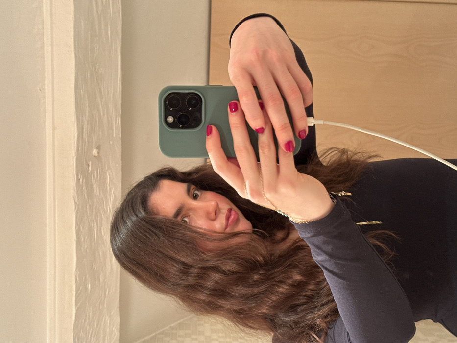 A woman with wavy brown hair and dark eyes takes a selfie in a mirror. She holds a light green smartphone with multiple camera lenses. Her nails are painted a dark pink. A white charging cable is connected to the phone. The woman is wearing a black long-sleeved shirt and a delicate gold bracelet and gold necklaces are visible on her wrist and shirt. The background includes a cream-colored wall and a light-colored wooden door.