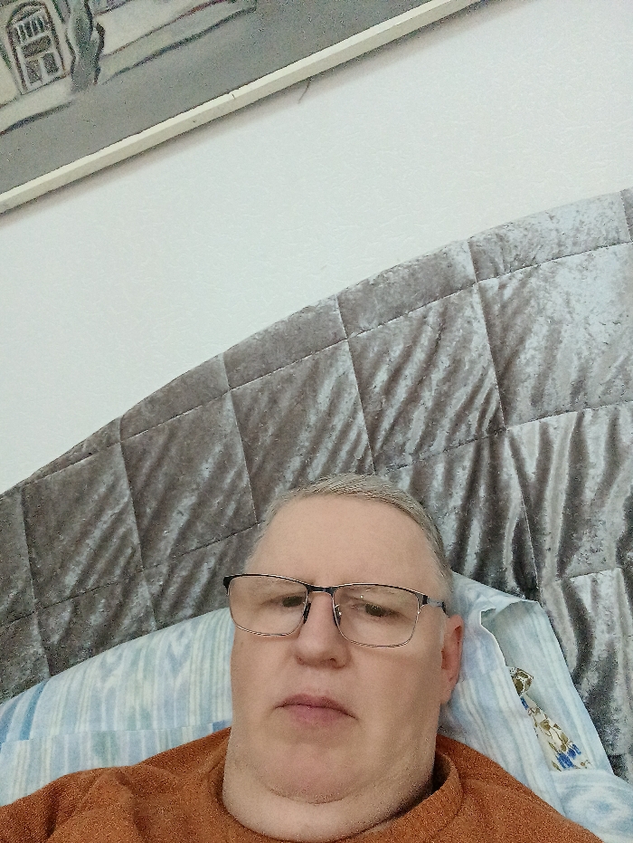 The image features a middle-aged to older adult male with light skin and short, grey hair, wearing rectangular-framed eyeglasses with dark temples and a light-colored bridge. He is looking directly at the camera with a neutral expression, positioned in what appears to be a reclining or resting posture indoors. He wears an orange, long-sleeved crew-neck garment. A pillow with a light blue and white striped pattern and a small floral-patterned patch is visible supporting his head on the right side. Behind him, to the right, is a grey, textured, quilted surface, likely a headboard or a padded wall panel. The upper left background reveals a plain, light-colored wall with a framed picture depicting a stylized urban scene, possibly a building facade with a window and a tree, rendered in muted greys and whites. There are no identifiable landmarks or unique architectural features within the image to specify a particular location within Tbilisi, Georgia.
