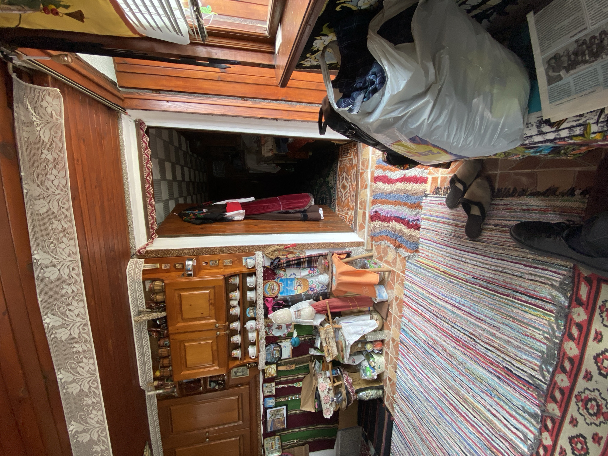 interior of a home in Stefan Karadja, Bulgaria. The scene is shot from an elevated perspective, looking down into a cluttered hallway. A wooden cabinet with decorative cups and other small items occupies the left side of the frame. Opposite the cabinet, on the right, is a carpeted area with multiple rugs layered on top of each other. A pair of slippers and a pair of black shoes are visible on the carpet. A large plastic bag filled with clothes and a newspaper sits near the entrance to the hallway. Beyond the hallway entrance is a darker area, possibly another room, with various objects stacked on a table. A lace curtain hangs along the left side of the frame near a wooden door. The overall environment is warm and lived-in, but disorganized.