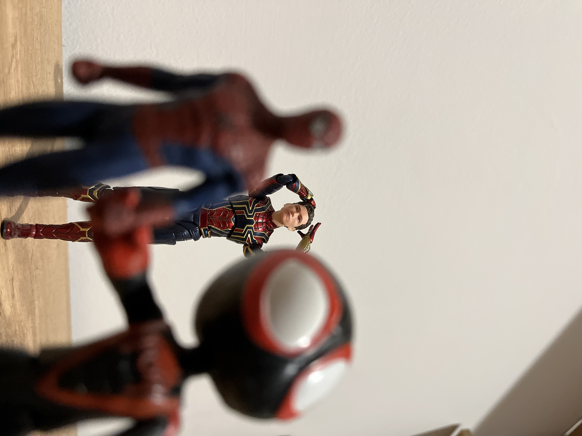An indoor scene displays three action figures against a plain, off-white wall, situated on a light brown wooden surface. In the immediate foreground on the right, a blurred action figure resembling Miles Morales in a black and red suit with large white eyes is positioned, facing the viewer with its left arm extended forward. To the left in the mid-foreground, a second blurred action figure, resembling Spider-Man in a classic red and blue suit, is positioned facing towards the center. In the middle ground, sharply in focus, stands an action figure resembling Peter Parker in the Iron Spider suit, characterized by red, blue, and gold accents. This figure's face is visible, and its hands are raised and clasped behind its head.