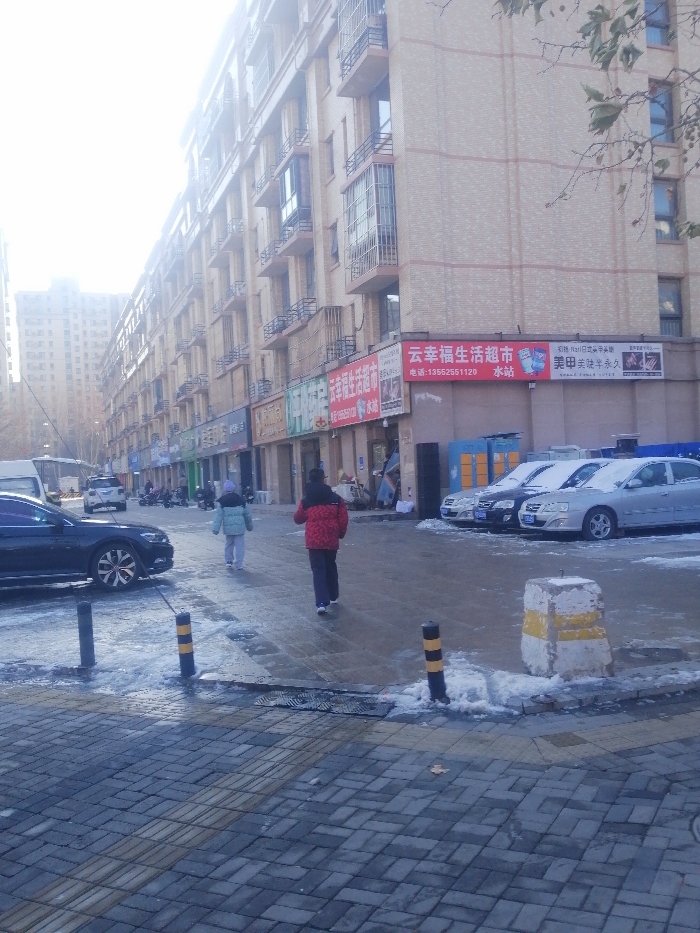 An urban street scene in winter. A multi-story brick building lines the right side, adorned with shop signs, including one that reads "Yun Xingfu Sheng Huochao Shi," a supermarket. Several cars, some with snow on their roofs, are parked alongside the building. Two people walk away from the camera on the snowy sidewalk. The foreground features brick paving with patches of snow.