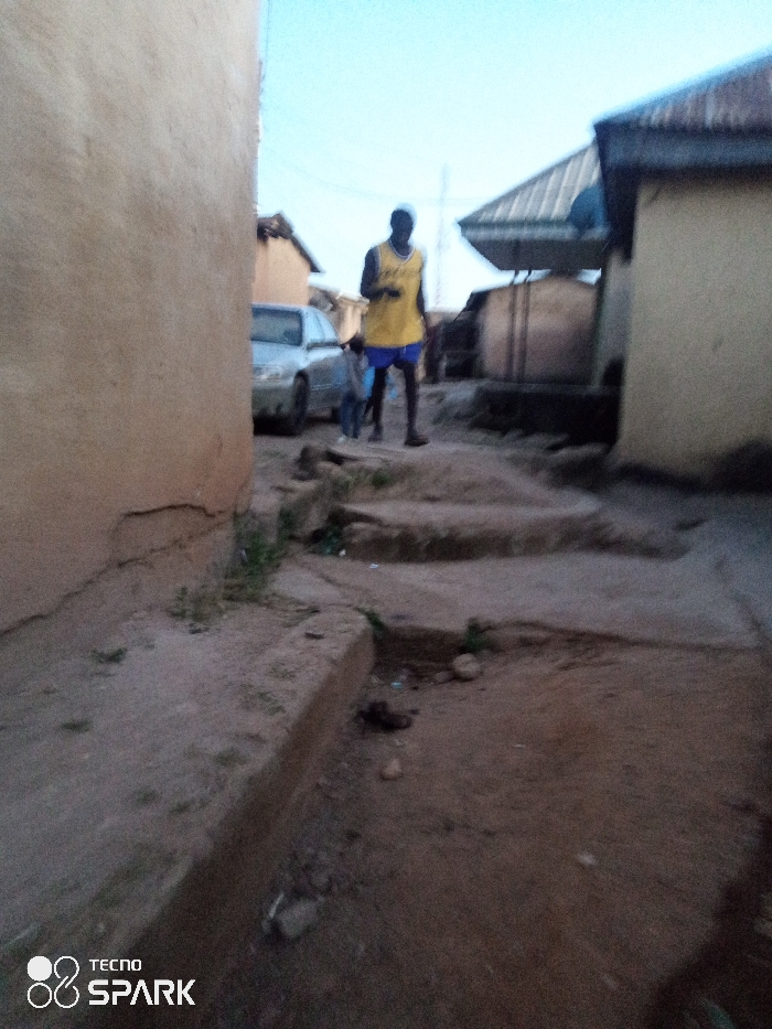 This image depicts a residential street scene in Jos, Nigeria, characterized by unpaved ground and rudimentary structures. In the foreground, an uneven dirt pathway ascends slightly, marked by several crude concrete steps or raised sections. A prominent, light-colored building with vertical cracks on its lower half occupies the left side of the frame. Small green plants grow at its base. Two individuals are present in the middle ground: an adult male and a child. The adult male, with dark skin, stands upright, wearing a yellow sleeveless top, possibly a sports jersey, and blue shorts. A light-colored cap or cloth covers his head. He appears to be holding a light-colored object, possibly a mobile phone, in his left hand. A small child, largely obscured, stands near the adult male's left leg, wearing blue clothing. Behind the individuals, a silver-colored sedan car is partially visible, parked on the left side of the street. To the right, another light-colored building with a corrugated metal roof is visible, featuring a dark, circular satellite dish mounted on its side. In the background, additional low-rise buildings with corrugated roofs and what appears to be a utility pole or similar structure are discernible against a pale blue sky. The ground throughout the scene is composed of dirt and scattered debris. The overall lighting suggests either early morning or late afternoon.